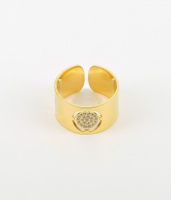 Bague jonc ajustable en acier doré à l'or fin et pavée en son centre d'une médaille de zirconiums brillants. Ultra chic et moderne, cette bague s'installe sur votre main comme une vraie pièce joaillière.
