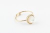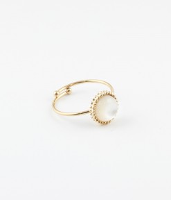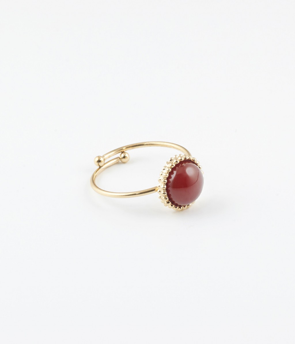 Bague ajustable en acier doré à l'or fin sertie d'un cabochon de pierre semi-précieuse, entouré de petites boules dorées.