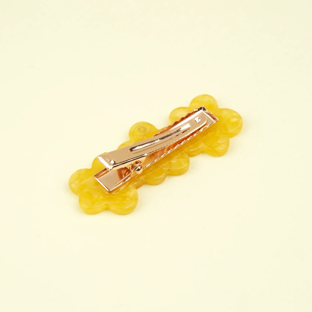 Une série de trois petits boutons d’or au cœur vert vif et aux détails dorés pour maintenir notre chevelure bien en place. Cette jolie barrette s’agrippe parfaitement aux cheveux des enfants comme des adultes pour un look délicieusement printanier.