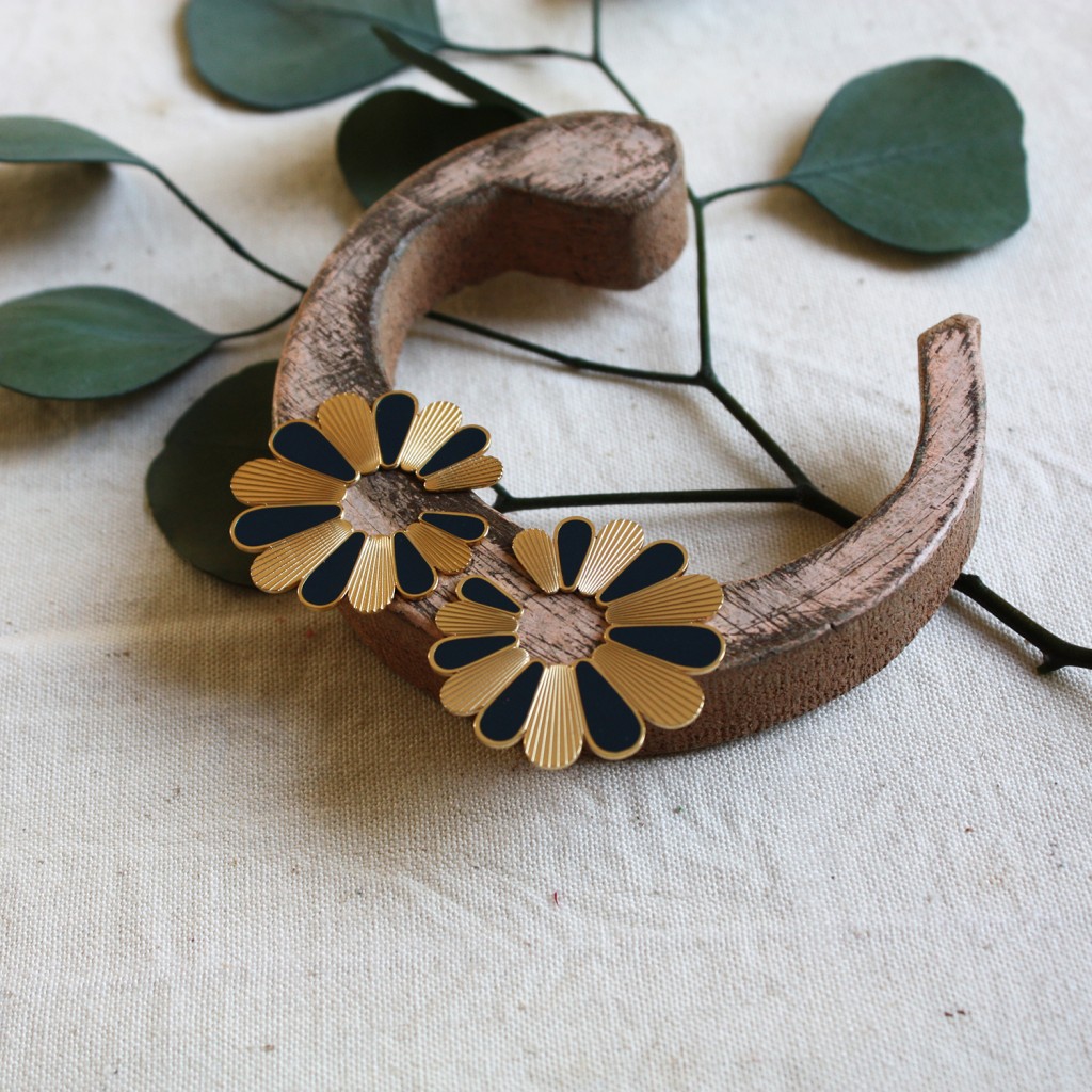 Grandes boucles en forme de fleur graphiques et vintage émaillée de couleurs. En acier inoxydable, vous aurez l'assurance de pouvoir toujours les conserver aussi belles qu'au premier jour et de pouvoir les porter sans réaction allergique.