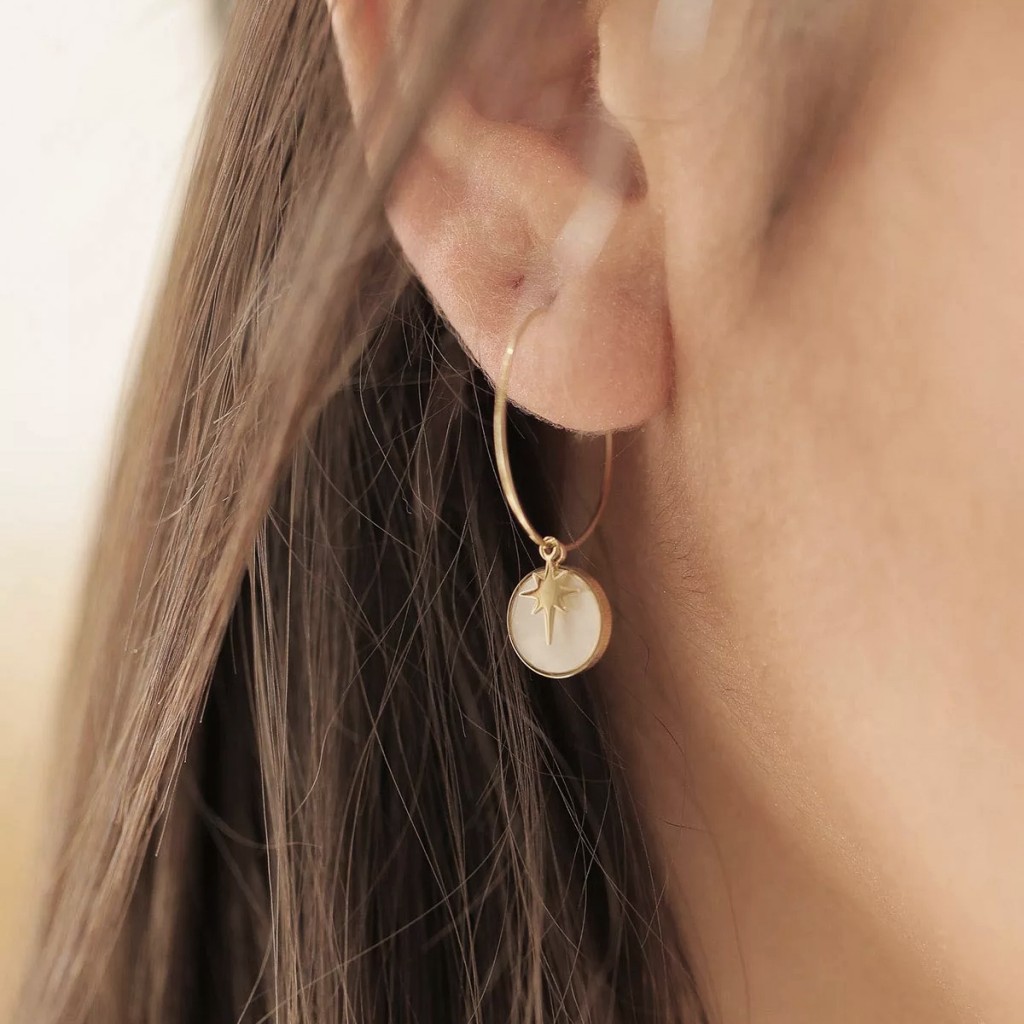 Boucles d'oreilles créoles en acier doré à l'or fin sur lesquelles sont attachées une médaille de nacre en serti clos et une petite étoile du Nord.