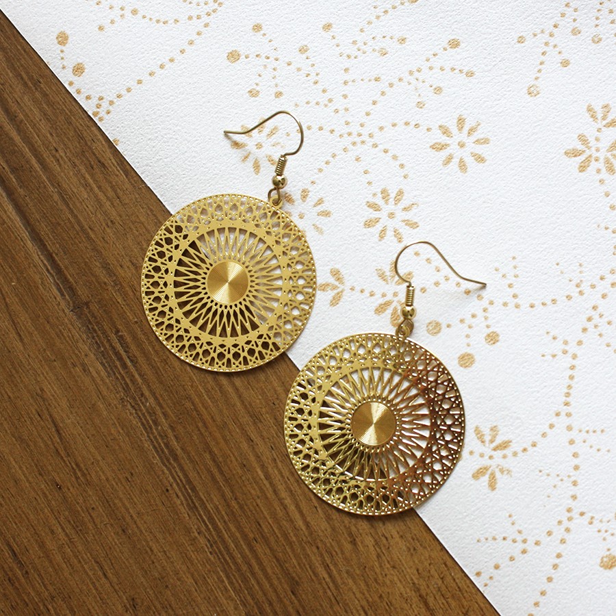 Boucles Nora pendantes dorées. Ces jolies boucles sont des créations originales Lulubel, réalisées avec soin dans notre boutique-atelier ! Matériaux : laiton doré à l'or fin Diamètre : 3,5 cm Bijoux sans nickel