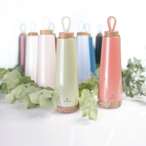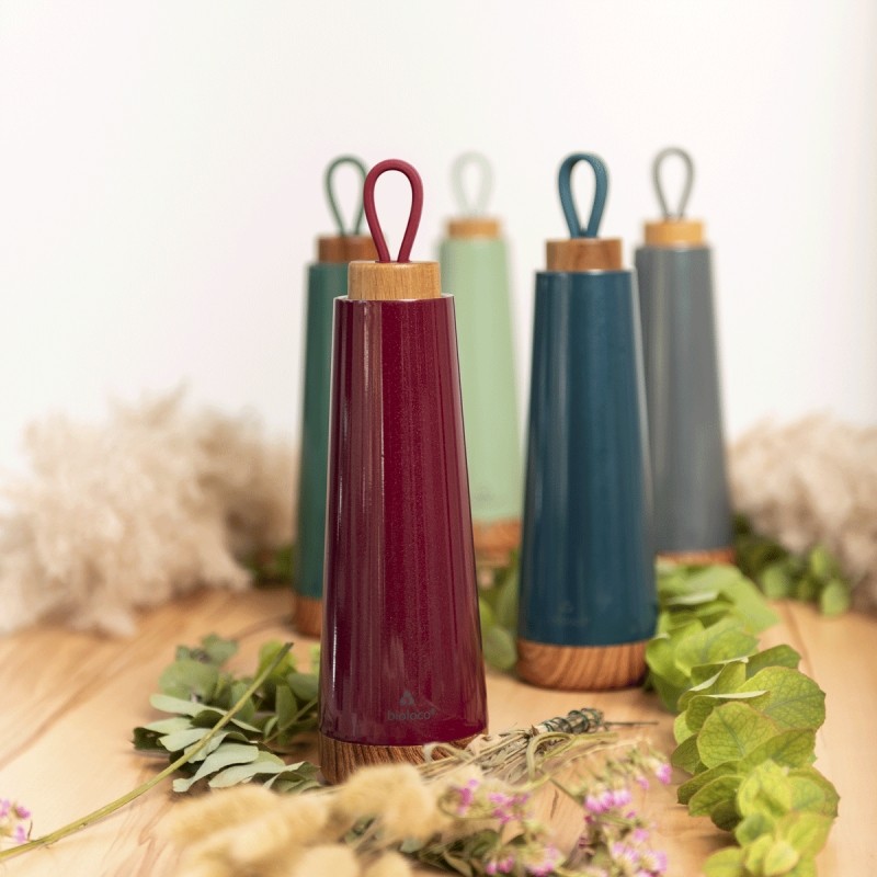 Le design simple et élégant aux couleurs tendances et actuelles est complété par un véritable bouchon en bois avec une poignée en silicone, qui peut être utilisé également comme une sangle de transport.