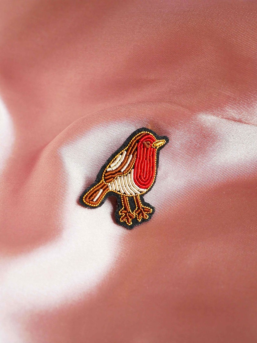 Une magnifique broche oiseau rouge-gorge poétique entièrement brodée à la main en fils cannetille.