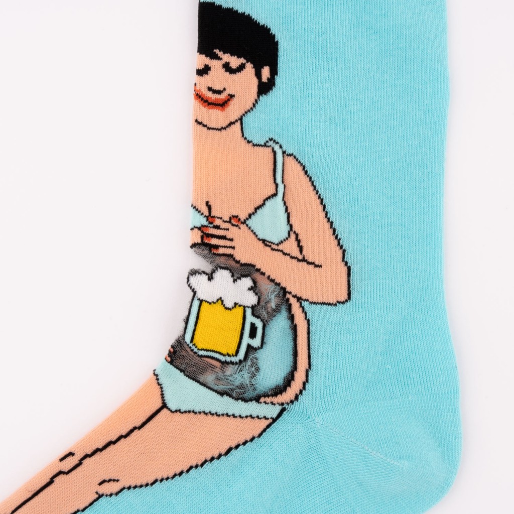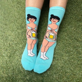 On a tous dans nos vies une copine réputée pour sa descente spectaculaire de binouze. Voici donc des chaussettes représentant une femme tout fière de son bidou fourré de bière pour rendre hommage à sa plus grande passion : finir les pintes plus vite que son ombre