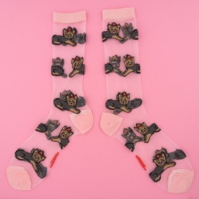 Un adorable petit groupe de Yorkshire, coiffés de leur plus beau nœ?ud rouge ! Des chaussettes transparentes aussi kitschs qu'adorables, à jolies bordures vieux rose à faire dépasser de ses souliers à volonté !