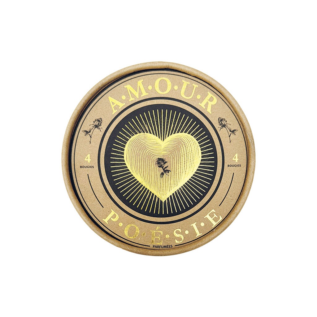 Très joli coffret rond de 4 minis bougies en pot (verre) pour découvrir les odeurs OPJET PARIS : thé à la menthe, cèdre, figue, jasmin. Coffret carton et impression dorure.