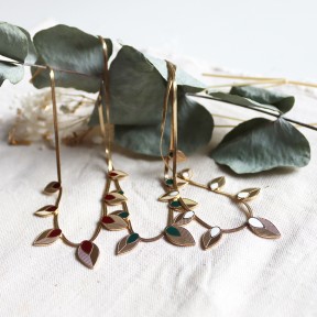 Collier plaqué or crée par Omacoo Paris. Une délicate chaîne maille serpent ornée de feuilles émaillées et finement gravées. En acier inoxydable, vous aurez l'assurance de pouvoir toujours le conserver aussi beau qu'au premier jour et de pouvoir le porter sans réaction allergique.