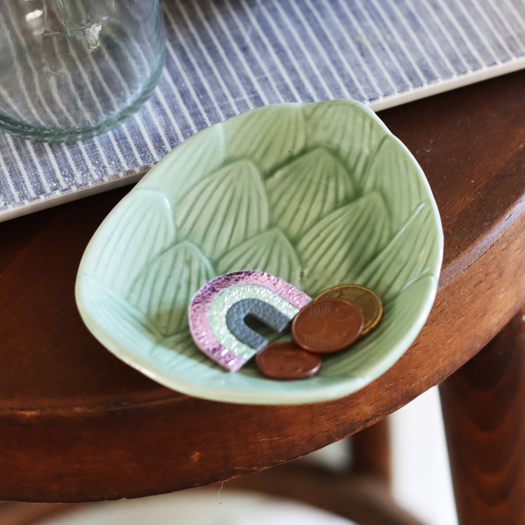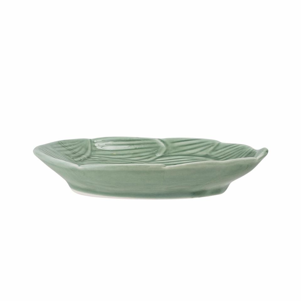 Coupelle vert amande en grès aux formes végétales, à utiliser sur votre table pour une déco fraîche et originale ou en joli vide-poche ! Matériaux : grès Dimensions : 12 x 2,5 x 10 cm Création *Bloomingville