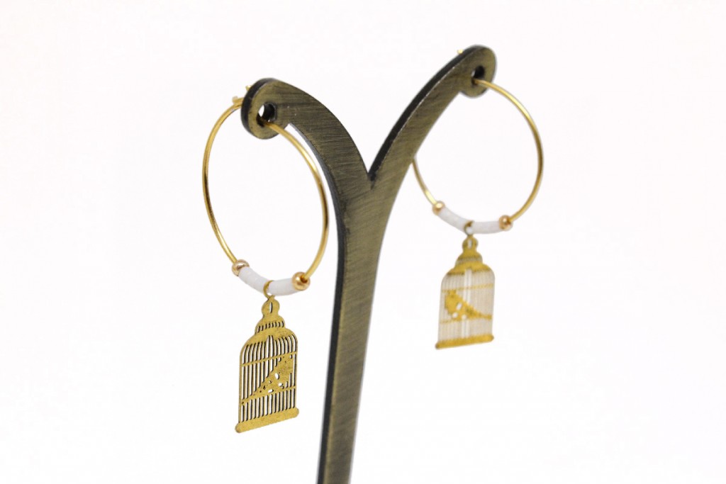 Boucles Bonnevent, petites créoles avec perles miyuki blanches et pendentif en forme de cage à oiseau romantique.