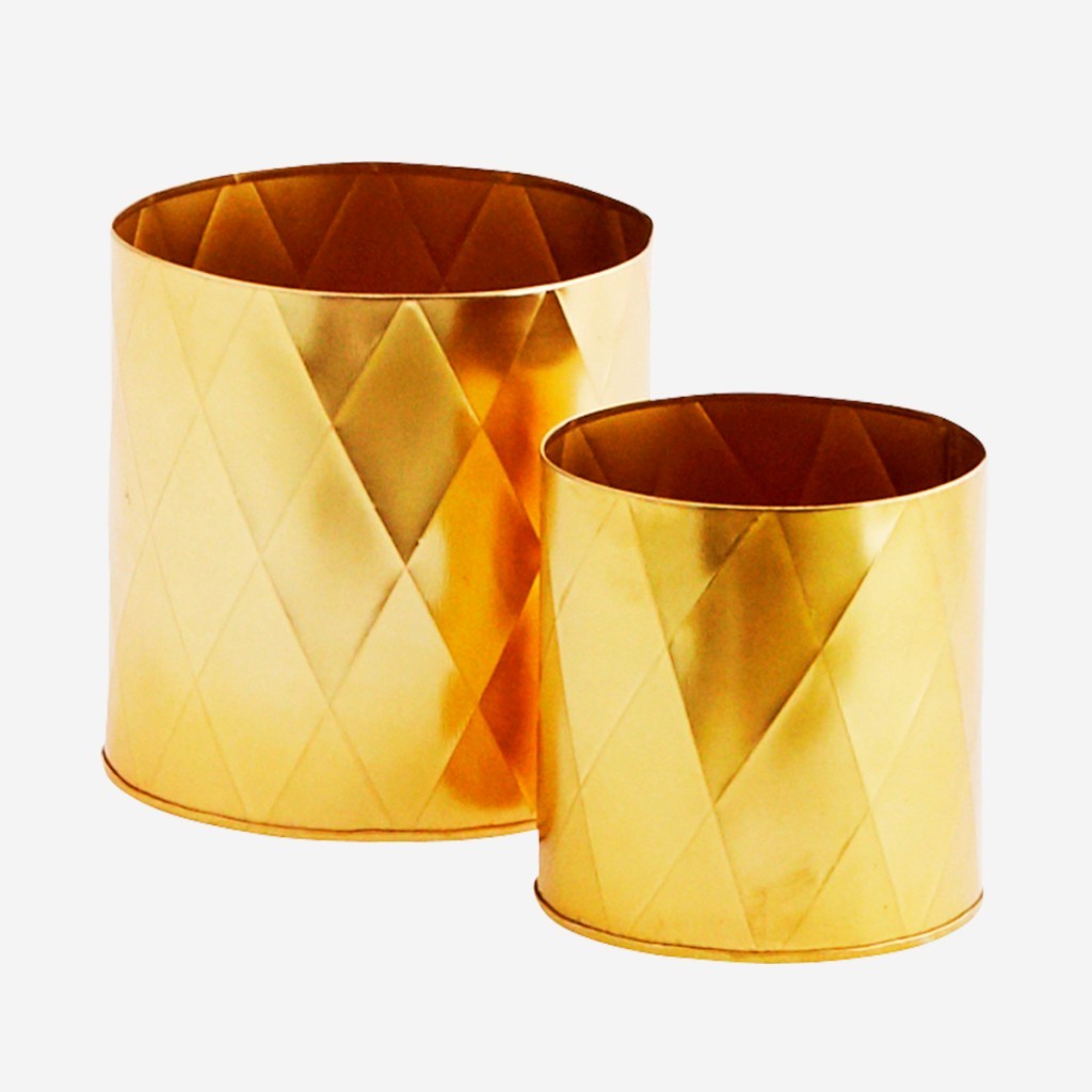 Duo de pots en fer embossés au motif Harlequin au fini brut, coloris doré. Matériau : Fer Dimensions : 10 x 10 et 13 x 13 cm Création Madam Stoltz