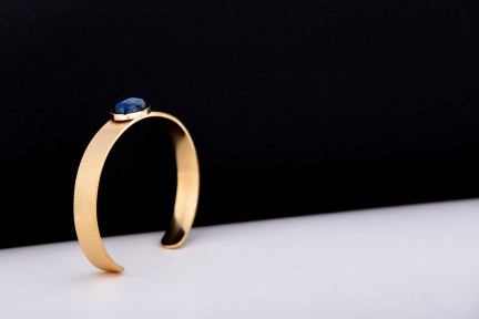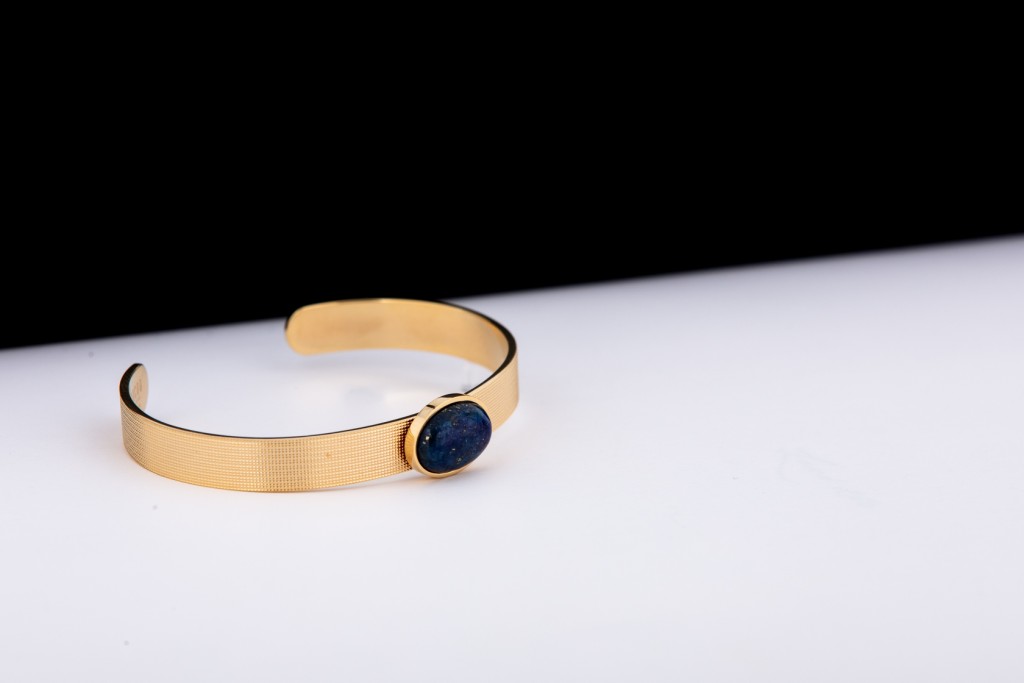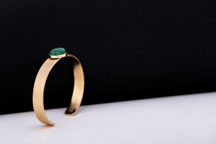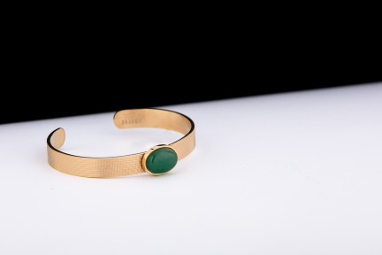 élégant et épuré, le jonc Barbara est en acier inoxydable gravé et doré à l'or fin et est fini par une magnifique pierre naturelle.