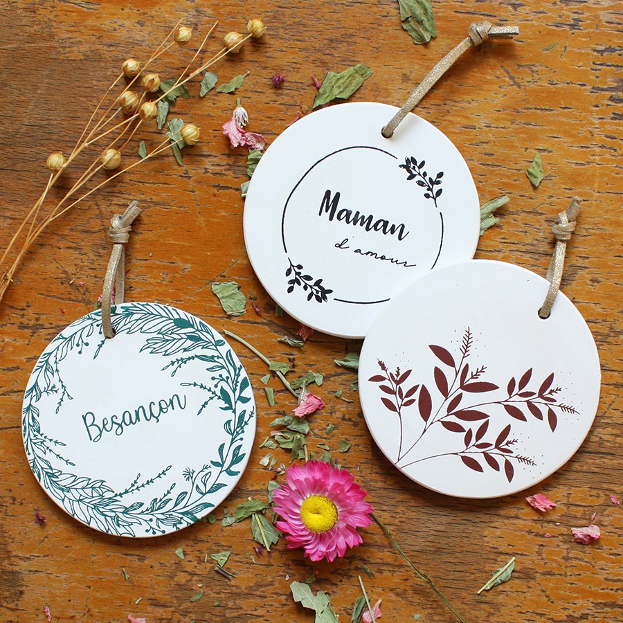 Médaillon céramique rond à accrocher. Sérigraphie, cordon doré.