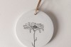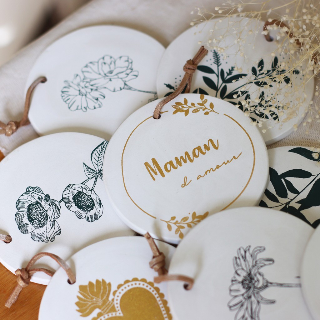 Médaillon céramique rond à  accrocher. Sérigraphie encre terracotta, cordon doré.