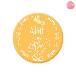 Magnet décoratif à message "Aime comme Merci" Couleur : Jaune Impression mate et toucher velours. Diamètre : 5,5 cm Création CréaBisontine pour Label'tour