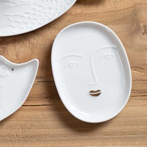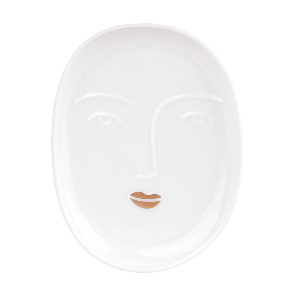Petit vide poche en forme de visage féminin en fine porcelaine émaillée et bouche dorée. Matériaux : porcelaine blanche émaillée et dorure Dimensions : 9 x 7 x 1 cm Création rà¤der (Allemagne)