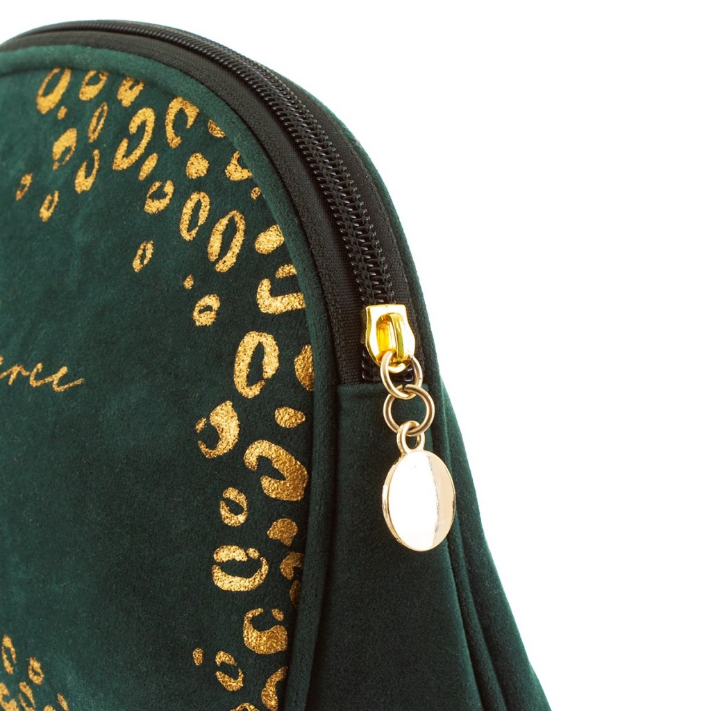 En velours vert forêt sérigraphié d'un léopard et de l'inscription Stay Fierce au dos, au milieu de motifs dorés.
